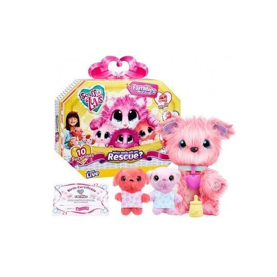 Adotta un vero cucciolo Salva dalla strada un cucciolo triste e tremante e trasformalo nel tuo migliore amico. Contenuto: 1 batuffolo mamma misterioso (cane/ gatto) glitterato, 2 o 3 cuccioli misteriosi, 1 certificato d’adozione con data di nascita da scoprire, 1 biberon con gusto a sorpresa, 1 spazzola, 1 collare con medaglietta, 1 foglio di adesivi e 2 o 3 vestitini per i cuccioli.