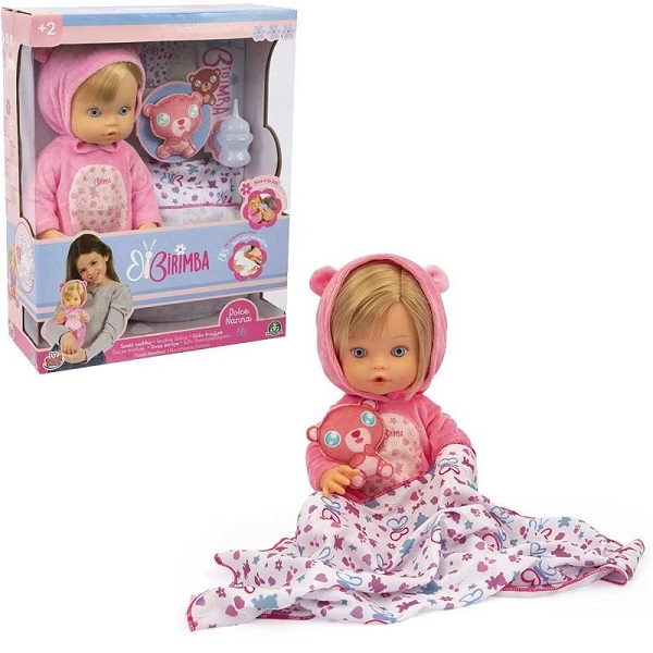 Birimba Dolce Nanna è pronta per andare a letto con la sua copertina e il suo pupazzino.