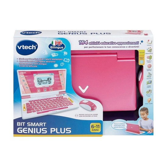 Con Bit smart genius plus l’apprendimento diventa un’avventura entusiasmante in italiano e in inglese! Questo computer educativo bilingue è una vera e propria postazione di lavoro per bambini, dotato di tastiera QWERTY, mouse con filo e schermo retroilluminato. Con 164 attività educative che coprono tutte le materie scolastiche, accompagna i bambini dai 6 agli 11 anni nell’apprendimento delle basi, divertendoli allo stesso tempo. 100% sicuro: nessun browser internet, nessuna connessione Wi-Fi richiesta, facile da usare!