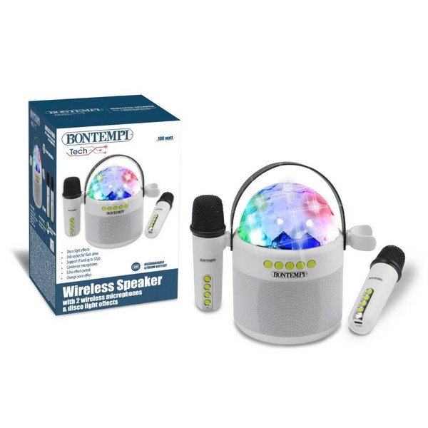 Cassa acustica wireless con microfono senza filo e luci RGB • Puoi ascoltare musica/audio: – da micro SD card (non fornita); – da smartphone, tablet, PC/Laptop, ecc. (cavetto di connessione non incluso); / utilizzando la connessione wireless (Bontempi490210) • Regolazione dell’effetto eco • Regolazione volume del microfono • Tasto attivazione effetti luminosi • Effetto cambiavoce • Regolazione volume del brano in esecuzione • Tasti di selezione brano precedente/brano successivo • Slot per micro SD card (TF) • Presa USB Tipo-C per ricaricare la batteria al litio (cavetto di carica fornito) • Dim: Speaker h=115 mm Ø=95 Microphone h=140 mm Ø=40