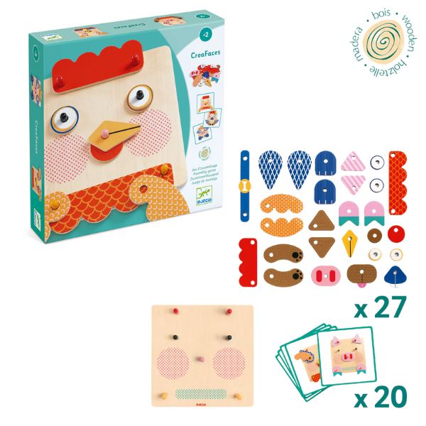 CreaFaces è un gioco per imparare ad assemblare e maneggiare a partire da 2 anni. I bambini riproducono degli animali aiutandosi con delle carte modello e posizionando i pezzi di legno sul pannello. Utilizzando le parti che costituiscono il coniglio, il cane, il maiale e la gallina, possono divertirsi a inventare anche altri animali più strambi!