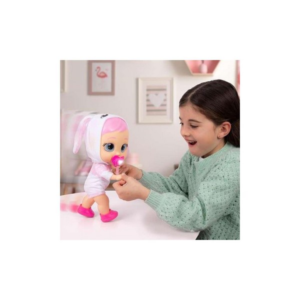 Incontra Dreamy dei My First Steps Cry Babies e aiutala a muovere i primi passi. Indossa un fantastico completo da passeggio ed è pronta a camminare. Prendile le mani e guidala in avanti per insegnarle a muovere i primi passi. Mentre cammina, emetterà allegri suoni da neonato. Ha braccia e gambe snodabili e può sedersi! Inoltre, piange a dirotto quando non tiene il ciuccio in mano. Mettiglielo e smetterà di piangere, e anche il ciuccio si illuminerà! Include un paio di vestiti, un ciuccio abbinato e un paio di scarpe.