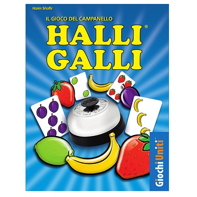 Gioco molto semplice ed intuitivo, con poche regole e tanto divertimento che hanno reso questo stimolante e avvincente gioco di carte un titolo di riferimento importante nell’ambito dei family games. Ideale per affinare colpo d’occhio e abilità nel calcolo per i più piccoli, Halli Galli è un gioco di velocità ideale per tutta la famiglia. 56 carte che rappresentano dei frutti vengono distribuite ai giocatori che le pongono in un mazzetto coperto davanti a loro. A turno ogni giocatore gira velocemente una carta, formando così un secondo mazzetto; non appena sul tavolo compariranno 5 frutti dello stesso tipo, bisogna cercare di suonare il campanello posto al centro del tavolo: il primo che riesce a suonarlo ha diritto a prendere tutte le carte dei mazzetti scoperti e porle sotto il proprio mazzo coperto. Si procede in questo modo fino a quando un giocatore sarà riuscito a prendere tutte le carte in gioco e aggiudicarsi così la vittoria