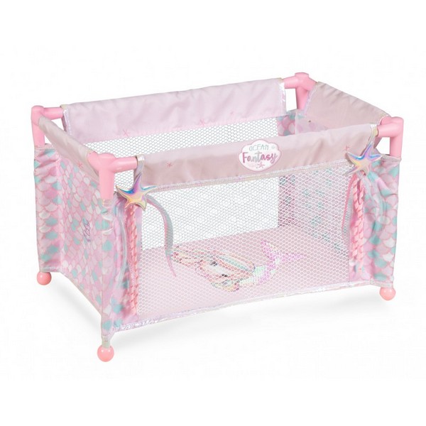 La confezione include: lettino da viaggio rosa della linea Ocean Fantasy con borsa da trasporto e ornamenti di peluche abbinati.