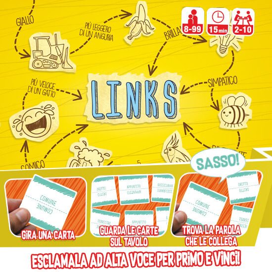 Links è un gioco originale e creativo che basa sull’associazione di idee. Ci sono sette diversi modi di giocarlo e, a seconda della modalità scelta, il gioco spazia dal Party Game al gioco a squadre, fino alla partita veloce.