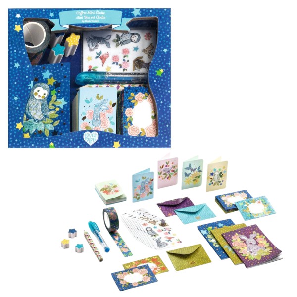 Contenuto: 1 scatola con finestra (18 x 15,5 x 3 cm) con 5 mini cartoncini + 5 mini buste + 4 fogli di stickers + 1 nastro adesivo + 1 penna a gel + 1 matita + 3 gomme.