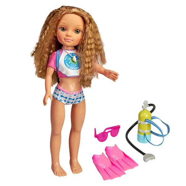 Con capelli lunghi con frisè, top da sub alla moda con uno slip bikini abbinato, è sommergibile ed è completamente attrezzata: maschera subacquea con boccaglio, pinne e bombola con l’ossigeno,