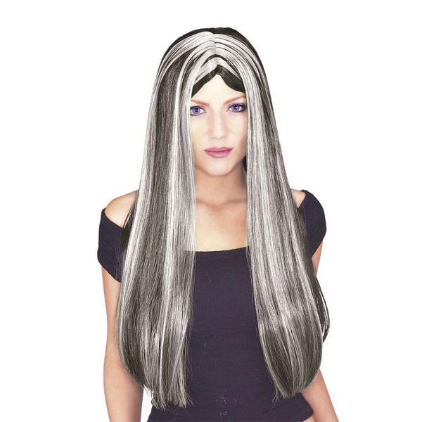Parrucca liscia lunga nera con ciocca bianca adulto