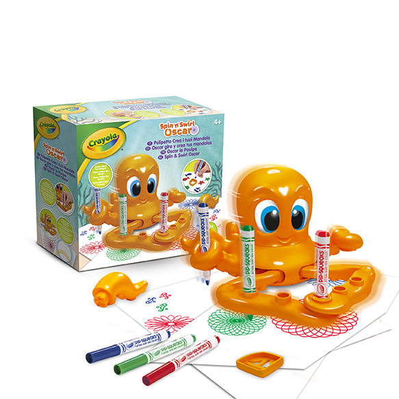 Il set gioco, Oscar il Polipetto, permette di creare tanti coloratissimi mandala. È sufficiente inserire uno o più pennarelli nei tentacoli di Oscar il polipetto, poi azionare l’unità, e Oscar comincerà a muoversi creando originali motivi, vortici e mandala tutto da solo! Oscar il polipetto però nasconde delle sorprese! I suoi tentacoli sono dei veri e propri stampini che si possono utilizzare per decorare e arricchire i disegni.