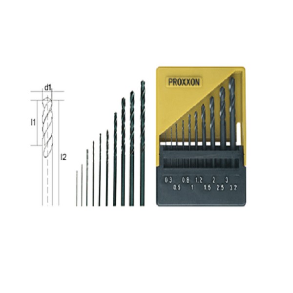 Set da 10 pezzi. Simile a DIN 338. Ø 0,3 – 0,5 – 0,8 – 1 – 1,2 – 1,5 – 2 – 2,5 – 3 – 3,2 mm. Per forare metalli non ferrosi, acciaio e acciaio inossidabile. In cassetta etichettata con funzione di ribaltamento e supporto.