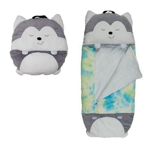 Simpatico saccoletto per bambini che una volta chiuso diventa un divertente morbido cuscino peluche da stringere e coccolare.
